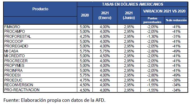 Con el objetivo de seguir apoyando el plan de recuperación económica del país a través de la dinamización del otorgamiento de créditos, la Agencia Financiera de Desarrollo (AFD) comunicó la segunda reducción de tasas de interés en dólares americanos en lo que va del año 2021 para todos sus productos.
