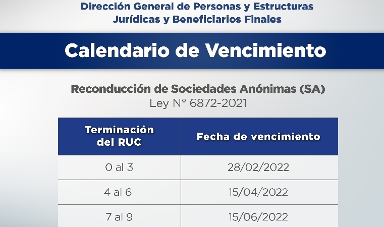 La Dirección General de Personas y Estructuras Jurídicas y Beneficiarios Finales (DGPEJBF) del Ministerio de Hacienda, a través del Decreto Nº 6583/22 de fecha 25 de enero de este año, comunica los plazos para el cumplimiento del proceso de reconducción de Sociedades Anónimas. Para el efecto, se estableció el calendario de vencimientos según terminación del Registro Único de Contribuyentes (RUC), a fin que las mismas puedan acogerse al régimen especial.