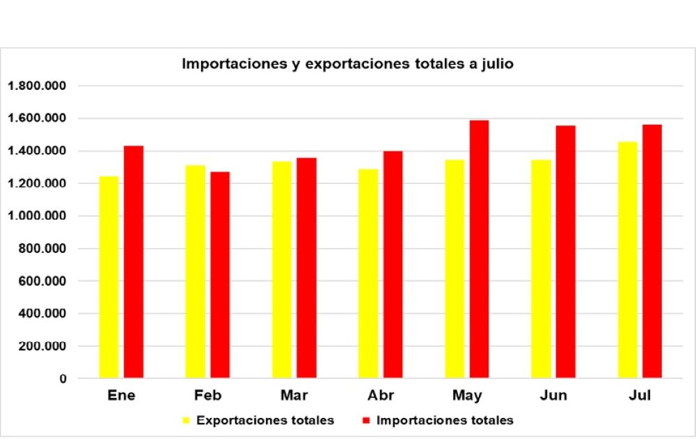 Mientras tanto, a julio de 2025, las importaciones totales alcanzaron USD 10.153,3 millones, 6,7% mayor a los USD 9.516,0 millones registrados a julio de 2024.