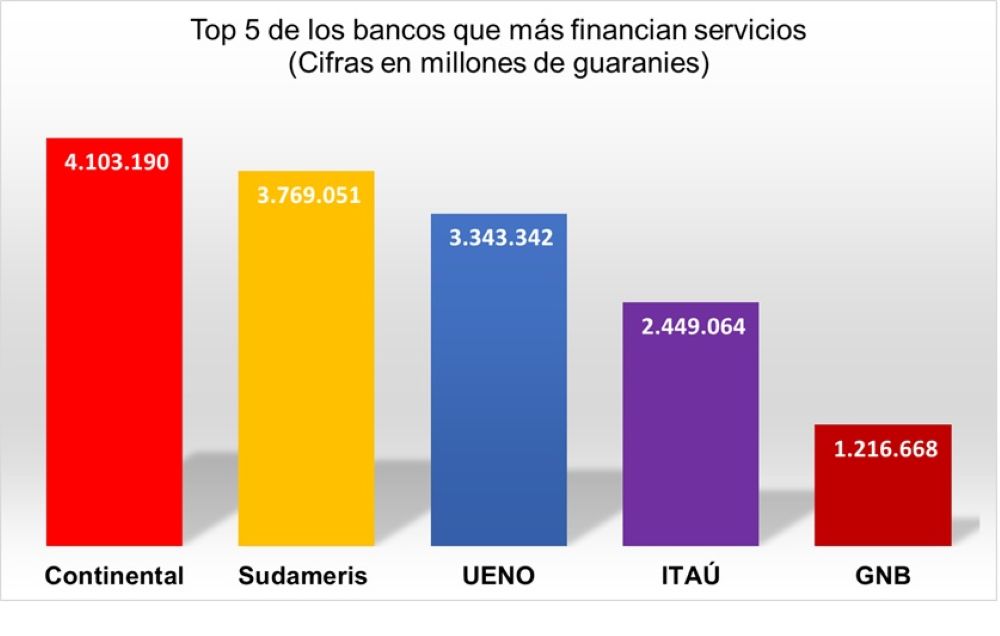 Las entidades que más se destacan por el financiamiento del sector servicios son: Continental, Sudameris, UENO, Itaú y GNB.