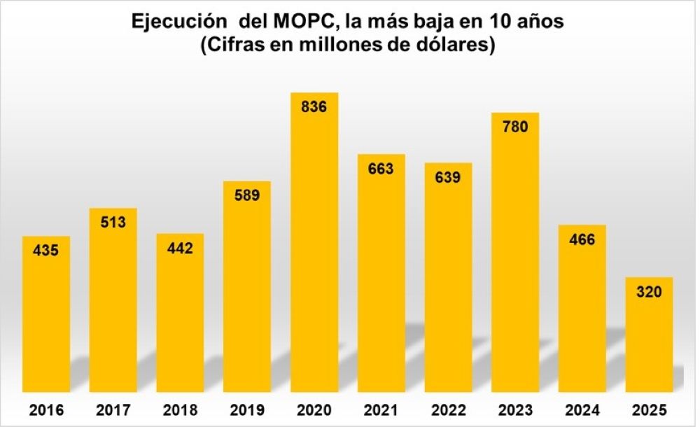 Hasta el mes de octubre la ejecución del presupuesto del MOPC llegó a apenas 320 millones de dólares, de 670 millones previstos para el año. Para este mes de noviembre se liberaron recursos por valor de 34 millones de dólares, con lo que se proyecta menor ejecución presupuestaria en 10 años.